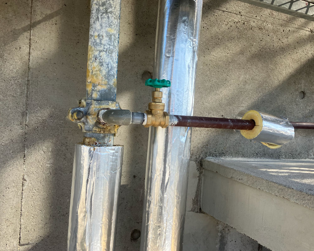 入り組んだ接続部分やバルブ周りも、田中が細部までこだわってきっちりと密着させて仕上げました。これで耐久性は大幅にアップし、冬の凍結対策もバッチリです!