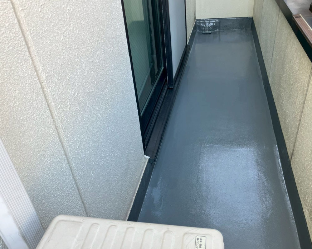 ウレタン防水は、複雑な形状のベランダでも「継ぎ目」を作らずに一体化して守ってくれるのが強みです。これで、これからの梅雨や台風の時期も、安心してお過ごしいただけます。