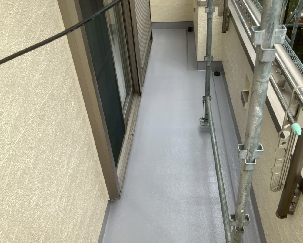 施工後の写真をご覧ください!隅々まで継ぎ目なく、均一にグレーの防水層を形成しました。